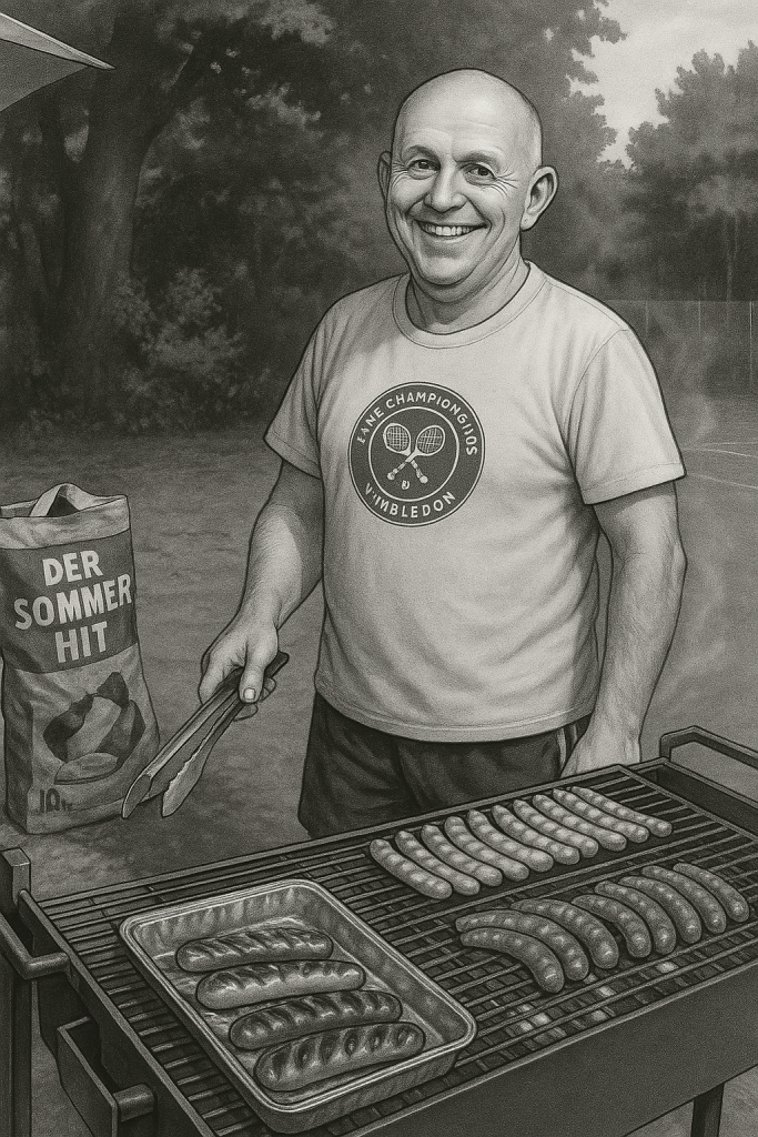 Mit seiner angeborenen Expertise rund um Wurst und Salami ist Delio am Grill von Hans ein gern gesehener und geschätzter Diskussionspartner. Eine der Grundregeln am Ramersdorfer Grill lautet: Das letzte Wort – und die letzte Wurst – gehören im Zweifel immer Hans. In den letzten 30 Jahren hat er nur einmal als Grillmeister bei einem Ramersdorfer Turnier passen müssen: Da weilte er mit Nils in Wimbledon. Die Engländer wollten auch mal gute Würstl – und nicht immer nur Erdbeeren mit Sahne.