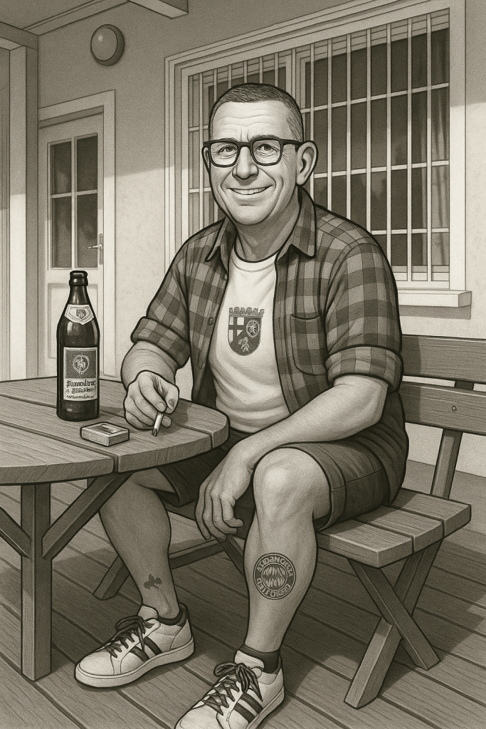 An den allerbesten Tagen sitzt Maddin auf dem Woita-Eberl-Gedächtnis Stuhl im Eck. Daneben liegt das rote Feuerzeug von Michi, mit dem er sich gleich eine köpft. Franz fläzt daneben, lässig zurückgelehnt und auch bei 30 Grad in Lederjacke. Mike referiert im Stehen im Tarnanzug aus dem Hintergrund, nicht selten mit einem Weißbier in der Hand. Gegenüber, je nach beruflicher Abkömmlichkeit, mindestens einer der Christians, Stefan und am Geländer dann Thomas mit seinem Tabak-Packerl. Der hat sich jüngst extra eine neue Hüfte einpflanzen lassen, weil er im Tennis-Magazin gelesen hat, dass das die Beweglichkeit erhöhe. Tatsächlich schießt er seine Glockenbach-Diagonal-Vorhand aus der Hüfte nun schärfer als je zuvor.