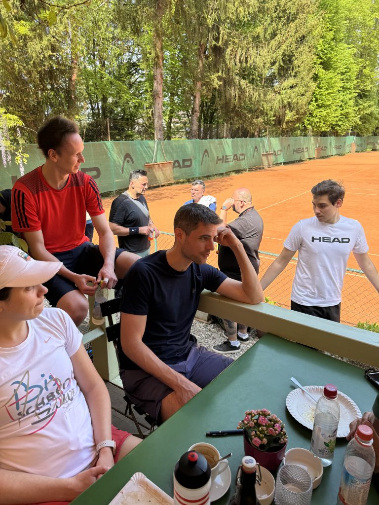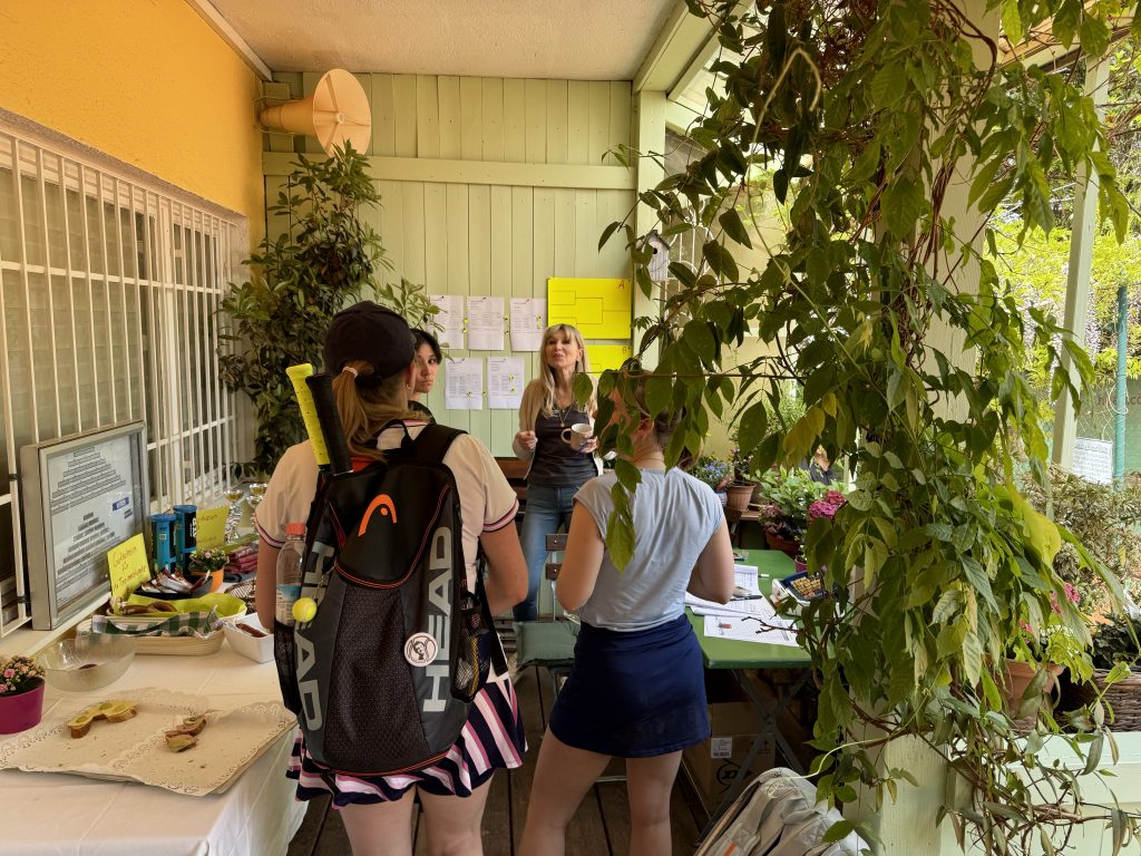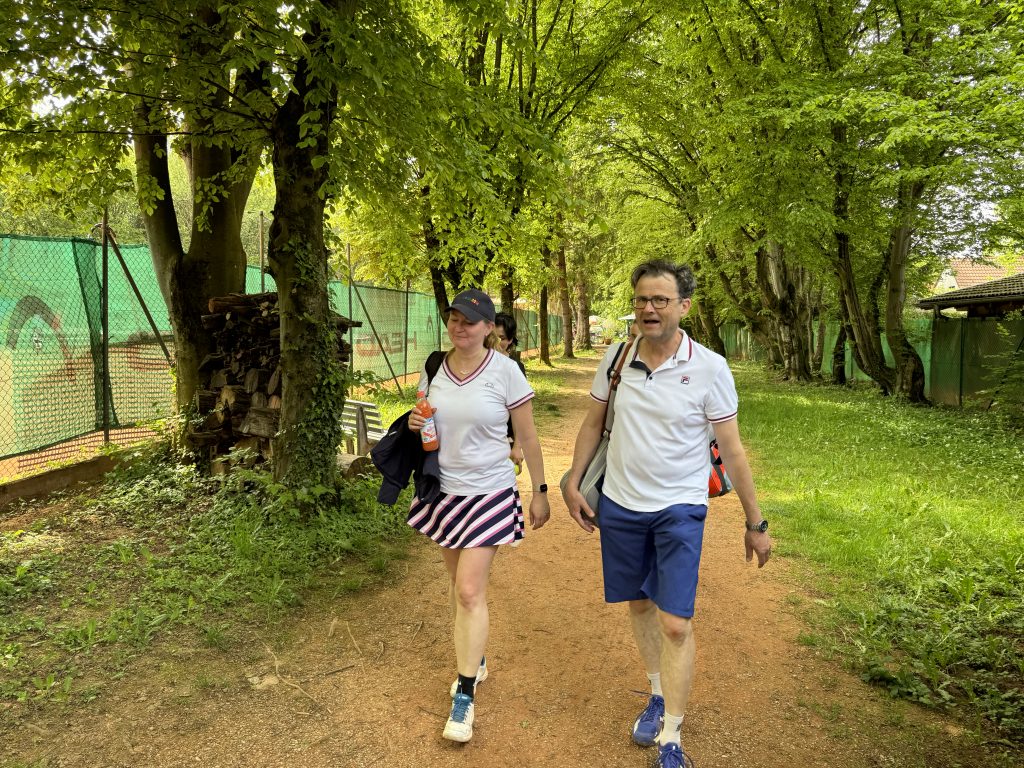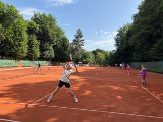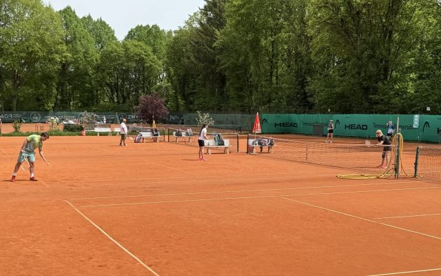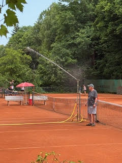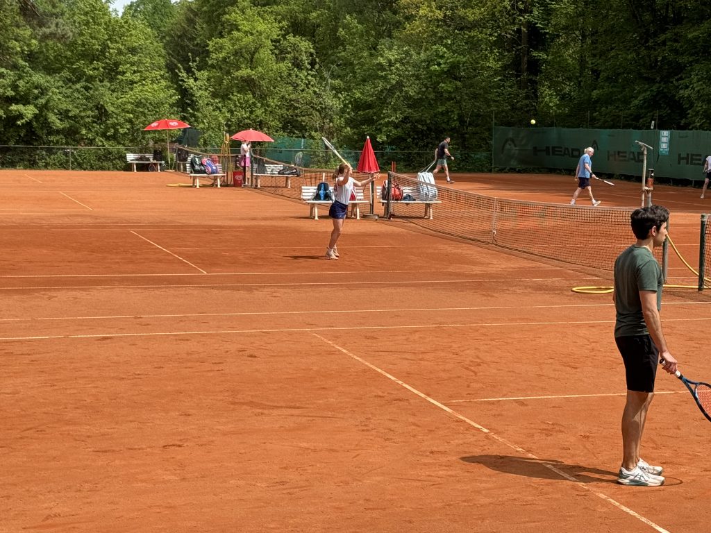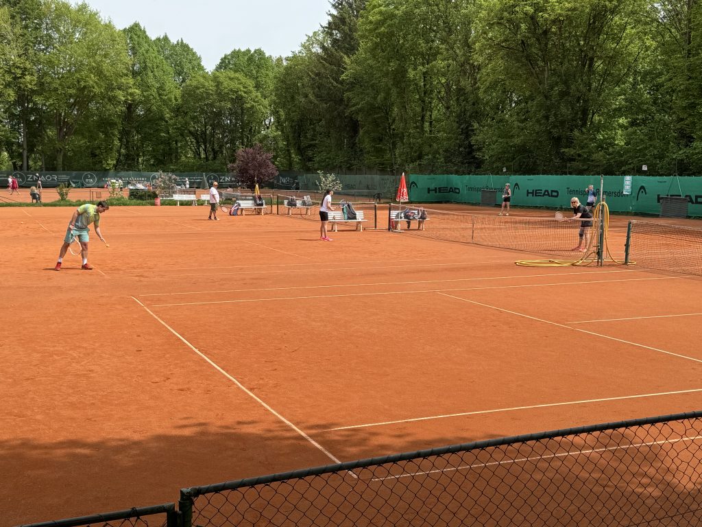 Über 50 Spielerinnen und Spieler starteten am 15. Juni um 10.00 Uhr in das erste große Turnier des Jahres im Tennispark Ramersdorf. Auf der Terrasse – die ein bisschen erinnert an die Villa Kunterbunt von Pippi Langstrumpf – mischten sich junge Athleten mit älteren Routiniers, schoben sich am Buffet vorbei und hielten letzte Schwätzchen in Sachen Taktik. Ein paar wenige probierten die Booster-Wirkung von alkoholfreiem Weißbier. Der Vorstand wässerte die Plätze und dann ging´s los!